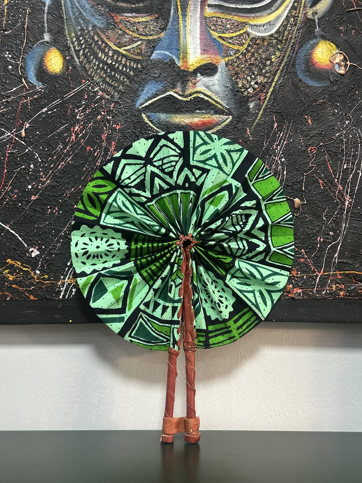 Abanico con diseños verde, amarillos, rojos, azules y amarillos.