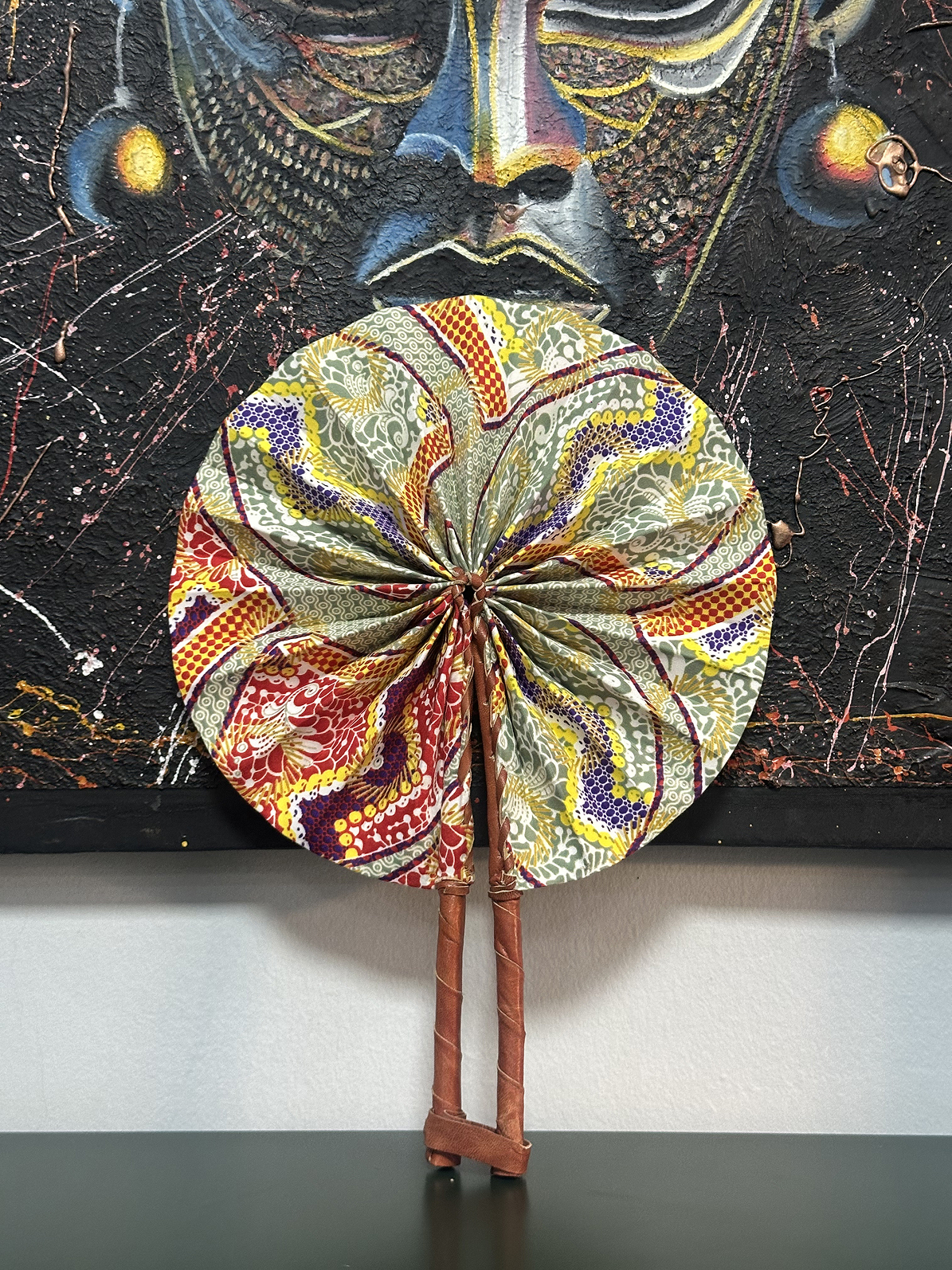 Abanico con diseños verde, amarillos, rojos, azules y amarillos.
