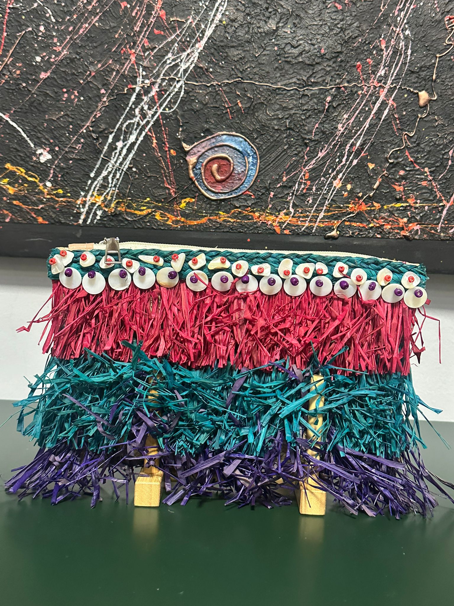 Bolso rojo con detalles en blanco y azul.
